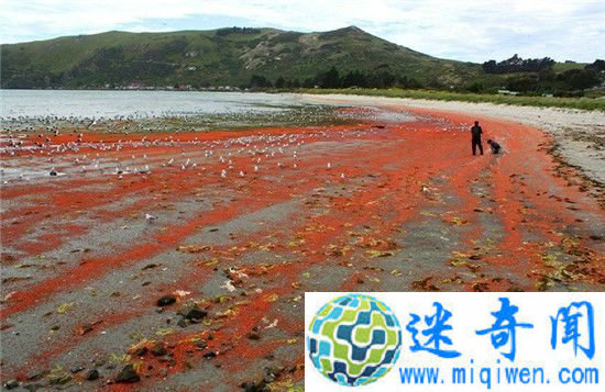 据外媒报道,新西兰居民保罗·范·坎彭(Paul Van Kampen)近日发现丹尼丁奥塔哥半岛附近水域鲜红一片,原来是一大群龙虾被潮汐冲到了岸边,“染红”了这片海。