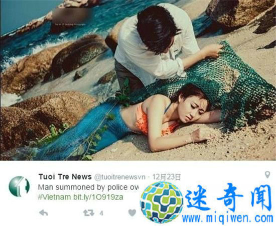 据媒体报道,越南一对新人将婚纱照传到到脸书上,新娘的美人鱼造型受人瞩目,却被网友拿来恶搞,以“渔民在广南省(Quang Nam)海滩抓到48公斤重的美人鱼”为标题,在其他网站上骗人。这消息让不少网友信以为真,越南政府只好出面灭火,并调查散播者行为。