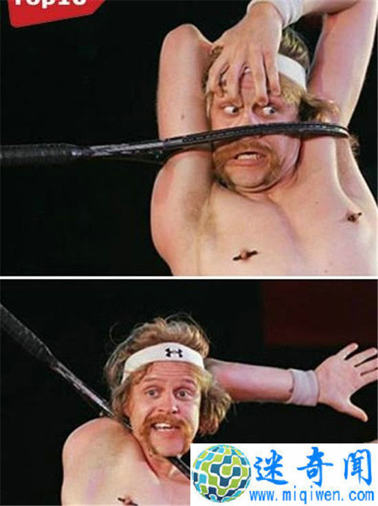 此人可谓天赋异禀,他的身体被认为是世界上最柔软的人体之一。图中正是他在展示自己柔韧的经典动作整个头部、胳膊、肩部和双臂全部穿过一个直径不到10英寸(25厘米)的网球拍。