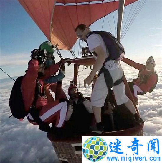 当他乘坐热气球升上13000英尺(约4000米)的高空,然后把降落伞和上衣扔掉,赤膊上阵,与身背降落伞的队友一同从热气球上跳下来,他在空中飞行了一段时间后,他的队友在空中抓住他,并一同安全降落到地面。