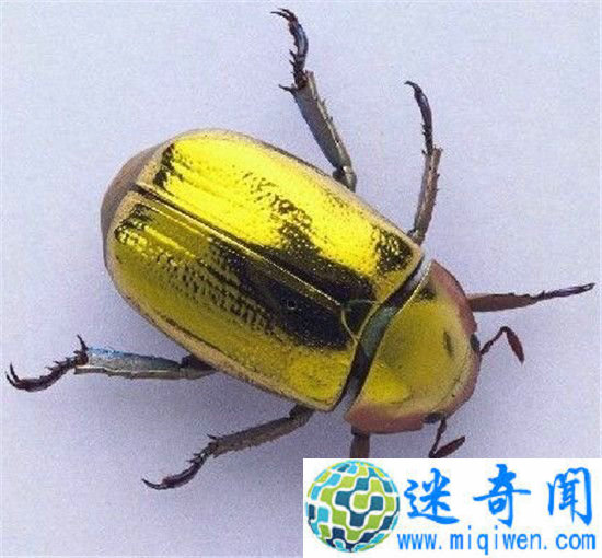 自然界存在着某些甲虫看起来如同24克拉的黄金珍宝,实际上只是它们的外壳闪闪发光,其中黄金圣甲虫和黄金龟甲虫就属于金色甲虫。由于它们的奇特外形,致使多年前人们大肆捕捉,现已濒临灭绝。