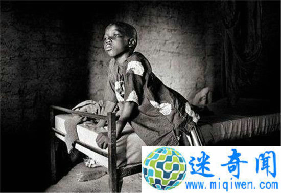 六岁的Rodrigue 半裸着身子躺在地上。Rodrigue四岁便失去了父亲,母亲患有阳性艾滋病毒病毒。这些孩子是艾滋病毒影响最脆弱的群体。
