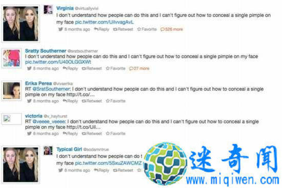 事情开始往Ashley没有想到的疯狂一面发展了!是几天后,一个名叫@virtuallyvivi的twitter账号转发了这张图,配上文字“天哪这是这么做到的?我甚至都不知道如何遮住我脸上的一粒小疙瘩”,由于这是一个校园账号,于是很快引起了一帮校内学生的讨论和转发...
