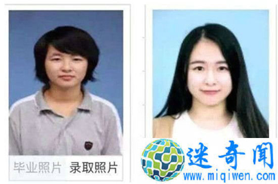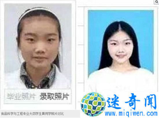 图为食品科学与工程专业大四学生黄同学照片对比。黄同学称第一张录取照片是自己高三毕业时在学校拍的。当时心思都在学习上,所有女生都扎马尾辫、穿校服,加上她碎头发多喜欢带个发箍,也不知怎么在镜头前笑,于是拍出来的照片就丑了。上大学后,黄同学加入了舞蹈团,由于经常练形体,她的精气神比以前好了很多。后来因为登台,她还特别去学习了表情管理,整个人就自信了许多。