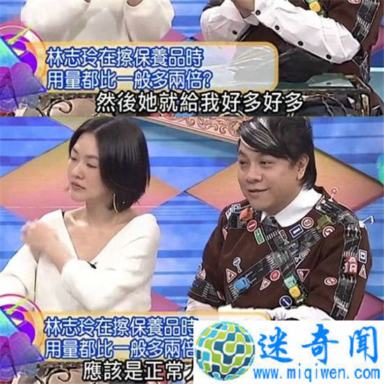 节目中,蔡康永突然发问林志玲是不是常常用很过量的护肤品,小S也说在后台的时候问她要一点护手霜,结果林志玲给了她超级多的量,大概是常人用量的三倍!而林志玲也萌萌承认说自己超级喜欢过量使用,尤其是护手霜之类的产品,甚至有出现因为擦涂太多护手霜而遭受握手另一方的嫌弃。