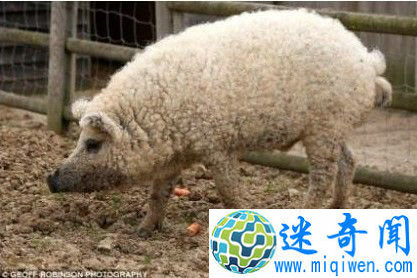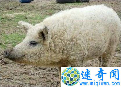 绵羊猪是一种身上长着“羊毛”的猪,产自匈牙利和奥地利,3年前作为已灭绝的卷毛猪后裔被引进英国。早在20世纪初,当时的奥匈帝国大地上生活着一种叫做“林肯郡卷毛猪”的动物,从外表上看,它既是一只绵羊但又更像猪。“林肯郡卷毛猪”一度被称为“绵羊猪”,当时的价格是1000美元一头,是普通猪价格的5倍。