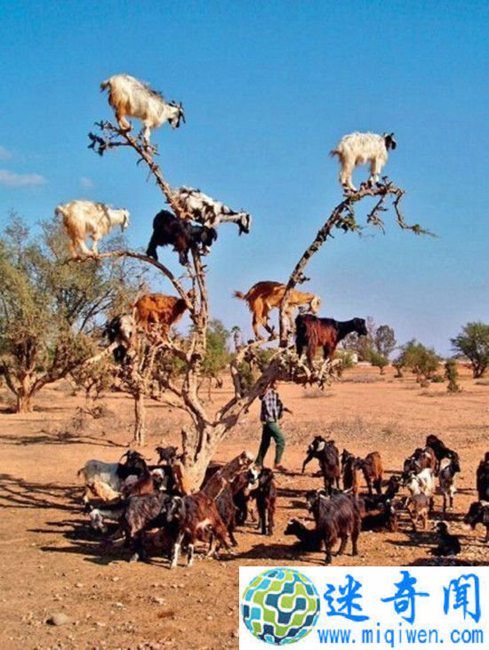 山羊爬树的现象大多数只发现于摩洛哥。这些山羊之所以爬树,是为了吃到阿甘树上的果实。这是一种类似于橄榄的摩洛哥坚果。阿尔甘树可高达8至10米。