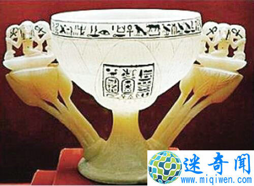 愿望杯,这个杯子发现在墓室的前厅,有可能是盗墓者丢弃在此的。杯壁的外沿刻着一句咒语如果你愿意把你的脸朝向北风,数年之后你将会看到幸福。