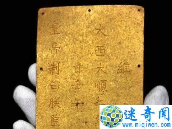 其中,金封册全部由黄金制成,重量达700多克,为国家一级文物。金封册长约20厘米、宽约10厘米,上书‘大西大顺二年’等29字,该页金封册应是封面,内容大致是张献忠在成都称帝后,颁布政令法规。在当时,它比圣旨的规格还要高一些。”
