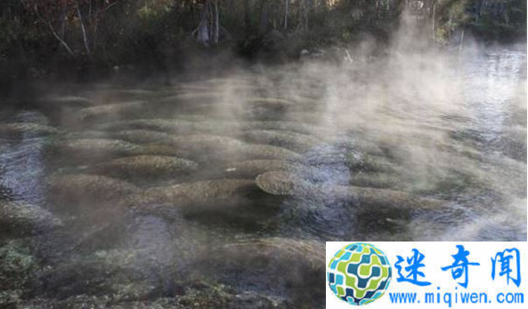 在这样一个烟雾弥漫的仙境一般的地方,有这些小天使一般的动物在这里游动着,又显得别样的神秘。当地的向导告诉这些游客这些动物的名称,就叫做海牛。