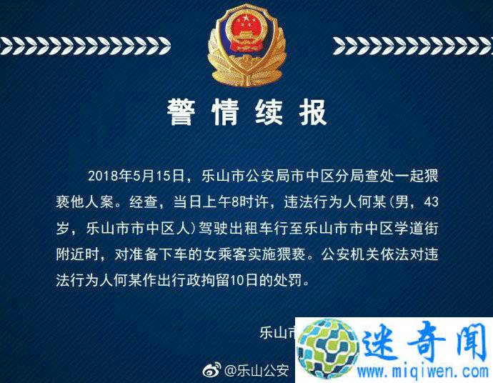 5月15日18时,四川乐山警方发布警情续报,2018年5月15日,乐山市公安局市中区分局查处一起猥亵他人案。经查,当日上午8时许,违法行为人乐山市市中区何某,其驾驶出租车行至乐山市市中区学道街附近时,对准备下车的女乘客实施猥亵。公安机关依法对违法行为人何某作出行政拘留10日的处罚。