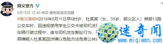 5月15日午间,北京市顺义区警方发布了情况通报。5月11日早6时许,35岁的顺义区女子杜某某在乘顺13路公交车时,因违规使用学生公交卡被司机发现并制止。杜某某产生不满,在车辆行驶过程中,遂与司机发生撕扯行为,严重影响公交车正常行驶。目前,犯罪嫌疑人杜某某因涉嫌以危险方法危害公共安全罪被顺义公安分局依法刑事拘留。