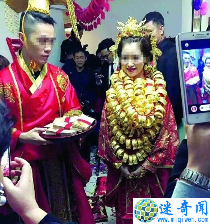 1月12日消息,在广东中山三乡举办了一场“土豪”婚礼,接亲队伍的座驾都是法拉利、保时捷等超级跑车。新郎不仅是一身“皇帝”装扮,兄弟伴郎团也都是以“将军”和“士兵”服饰出现。整个迎亲队伍庞大而又热闹。世界的奇闻异事,异种奇闻,奇闻2018,奇闻笔录,奇闻图片大全,新娘家中的沙发上摆满了成叠的现金大钞和多件珠宝首饰,新娘头上戴满了金首饰,脖子上挂着的金镯子更是满满当当。