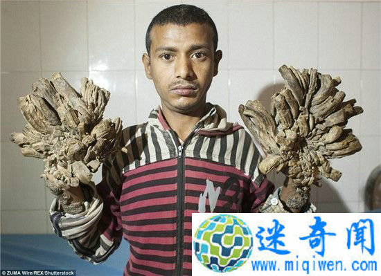 【奇闻快递】2月1日消息,据英国《每日邮报》报道,孟加拉国25岁男子Abul Bajandar不幸患上怪病,一种名叫“疣状表皮发育不良”(Epidermodysplasia Verruciformis)的罕见遗传性皮肤病,这让他变成了一个“树人”。