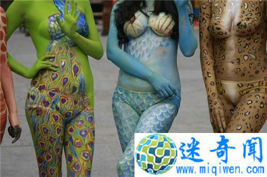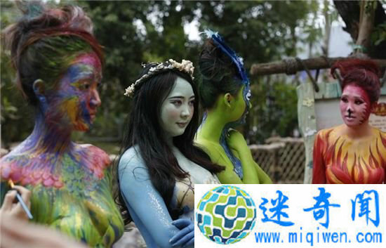 这些美女模特们被绘画师进行细致的全身彩绘,十分生动。