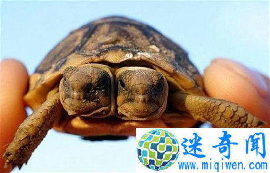 2003年,来自新西兰惠灵顿的诺埃尔丹尼尔斯在南非西开普发现了一只长着两个脑袋的小龟。当时这只龟只有一个月大,两个独立的头“共享”一个身体,每个头都能正常进食。
