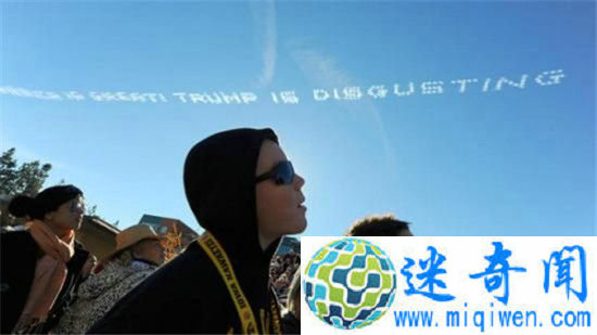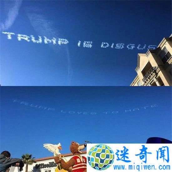 据美国有线电视新闻网CNN报道,当地时间2016年1月1日,美国加利福尼亚州举行了第127届玫瑰花车大游行。但在游行过程中,天空中的飞机突然喷出烟雾,并用烟雾写下了“美国很伟大,特朗普真恶心”一句话,令在场的观众瞠目结舌。
