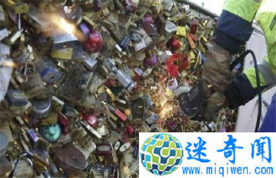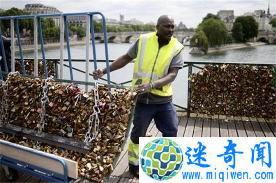 【奇闻快递】12月16日消息,日前,据外媒报道为了给巴黎的“爱情桥”减负,巴黎市政府1日开始拆除行动,清除塞纳河艺术桥上近百万个爱情锁,锁至少已有45吨重。
