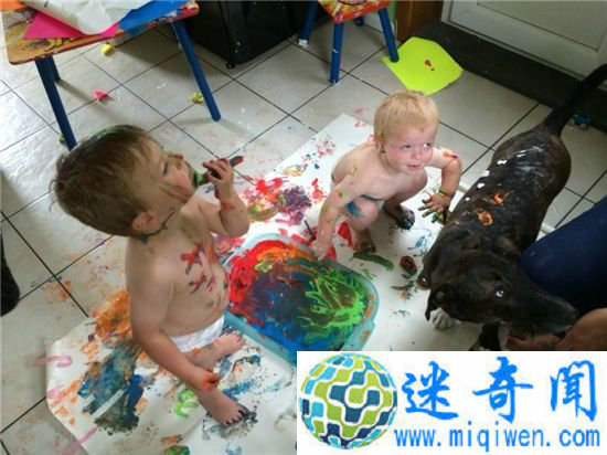 今年都是2岁的乔舒华和哈维,本应该在画布上涂画,却把自己的身体和脸当成了画布,甚至连家中的小狗都未能幸免。