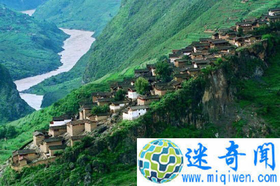 云南宝山石头城,百余户纳西人家聚居在一块独立的蘑菇状岩石上,三面均是悬崖绝壁,猿猴也难攀爬上来。